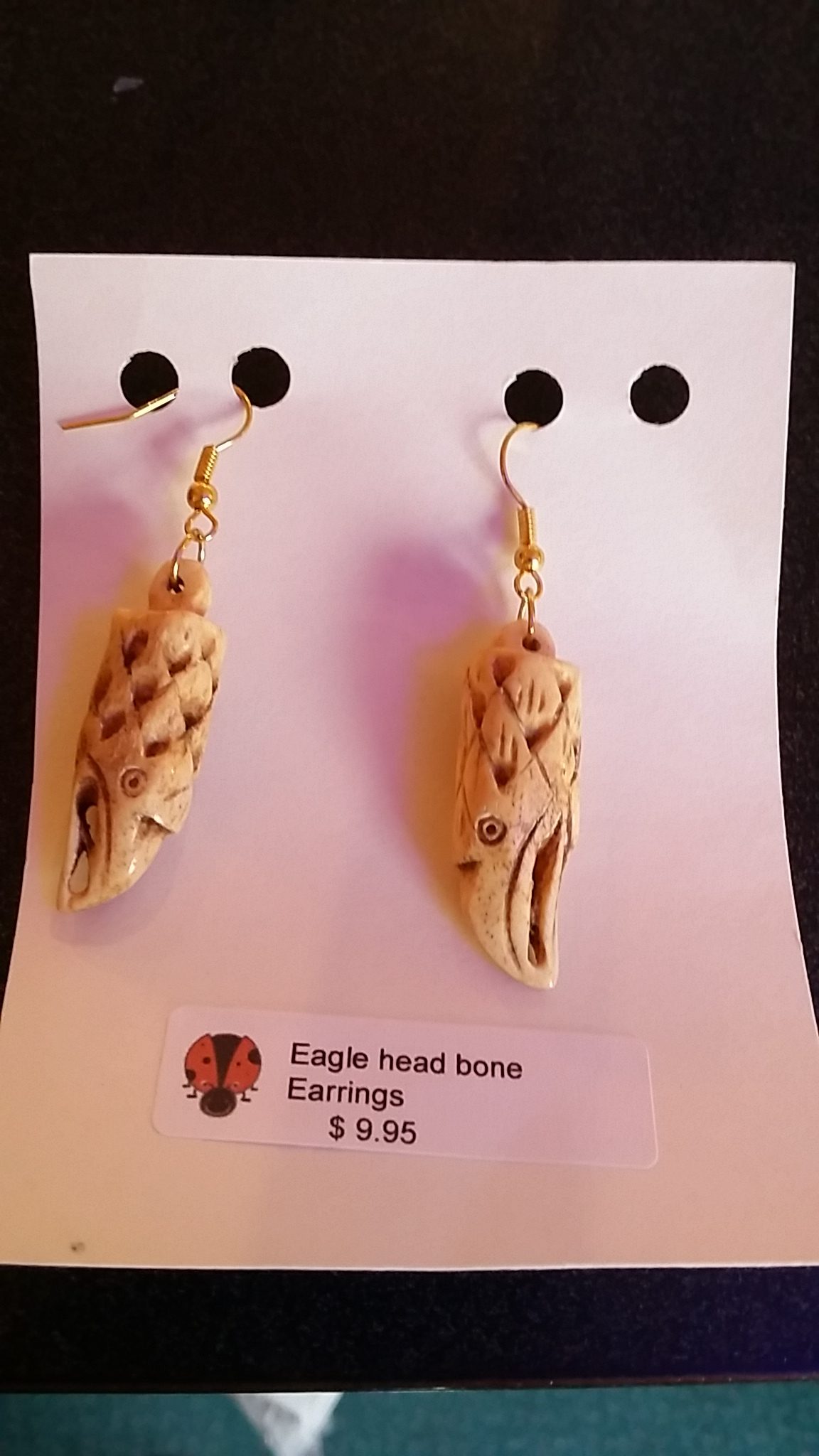 Eagle Head Bone Earrings $9.95 13 in stock Eagle Head Bone Earrings quantity Add to cart Sold By : SKU: 6032 Categories: Clothing and Jewelry, Jewelry Description Description Carved Eagle Head Earrings Related products Bottled French Poetry Necklace $17.95 Sold By : Danielle Romig Add to cart Mermaid Tear Necklace $17.95 Sold By : Danielle Romig Add to cart Bib and Burp Cloth Set (Animal Print) $17.00 Sold By : Live Dream Create Add to cart Brown and Bone Dog Kerchief (Small) $5.00 Sold By : Vicki Harbolt Add to cart