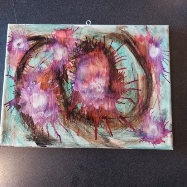 Original art by John B. Alexander. Collage on color canvas frame. Two-sided. Measures approximately 12″W x 9″H