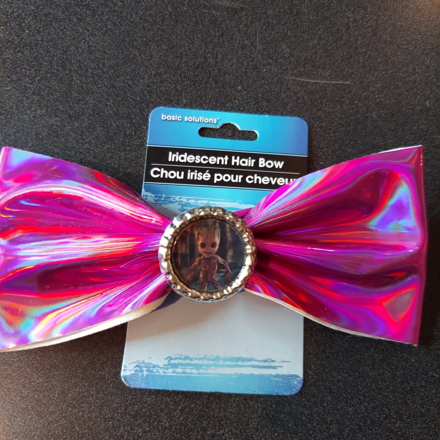Pink iridescent hair bow with image in the center. Bow features either Baby Groot or the artist known as Prince. If ordering online, please specify which you would like.