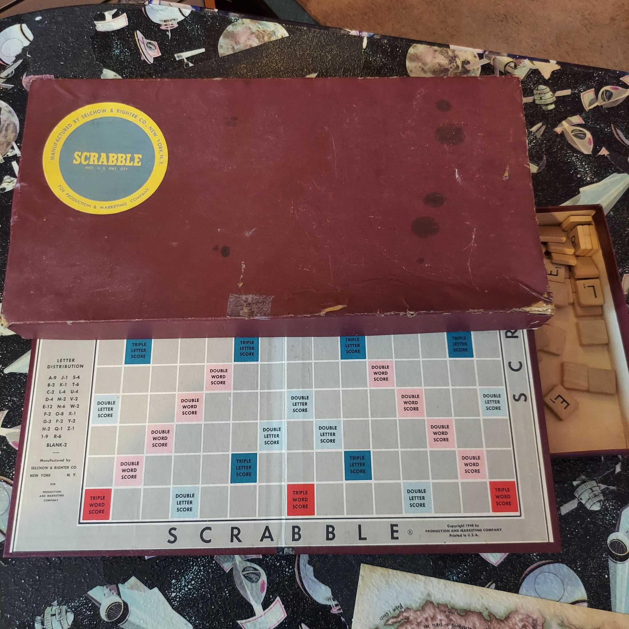 Vintage edition of classic board game Scrabble. This 1948 edition comes with all pieces including original board, tiles, and holders. Box has some damage, but still safely holds all pieces.