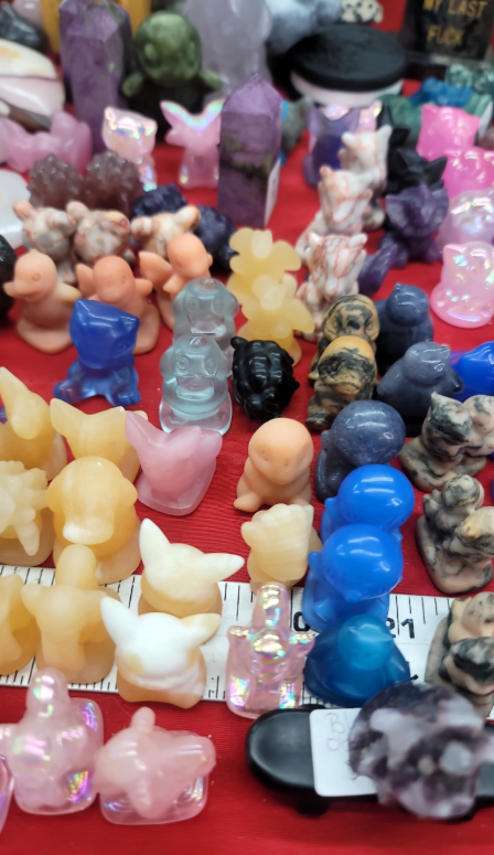 Once the raw stones and crystals have been obtained, then comes the hard part of determining what they should be transformed into. Between Jennifer and her children, they have no shortage of wild ideas! “My distributors laugh at the craziness I ask for. I have some ridiculous asks and I know this,” Jennifer laughs. Luckily no ask is too big, as they have been able to work together to create some amazingly detailed creations – from the recent additions to the food line up to a large grim reaper sitting on a toilet, the only limit is their own creativity. 🙂